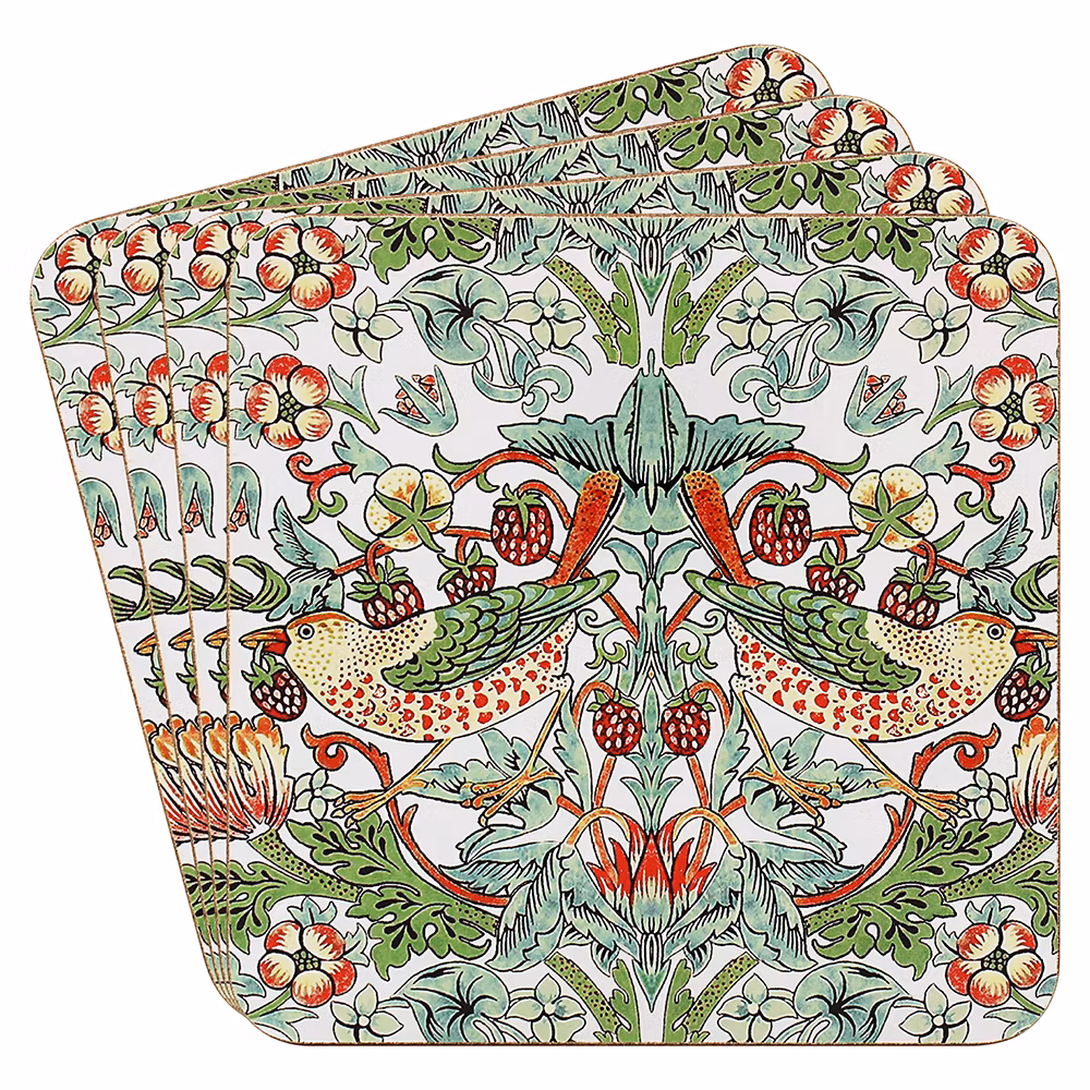 4 st glasunderlägg med kork med William Morris omåttligt populära White Strawberry Thief-motiv.
