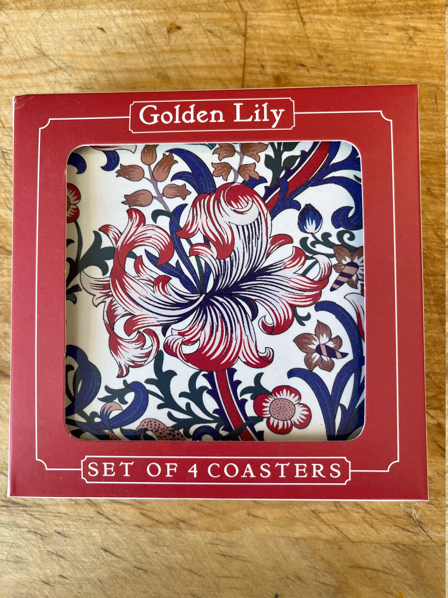 4 st glasunderlägg med kork i William Morris populära mönster Golden Lily.