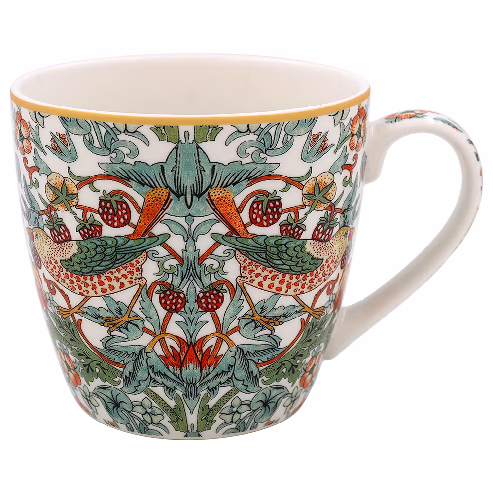 Tillverkad i fint porslin med William Morris populära mönster White Strawberry Thief. Tål både maskindisk och mikrovågsugn.Kommer i en fin individuell presentfö